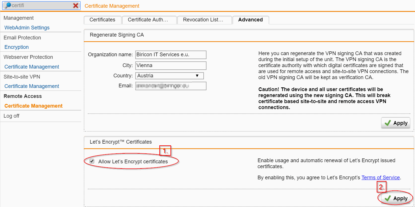 Wie fast überall in der UTM muss man die Möglichkeit eine Funktion verwenden zu können aktivieren. Hierfür öffnet man das Zertifikats Management und findet im Punkt Advanced die Möglichkeit Let's Encrypt zu erlauben.